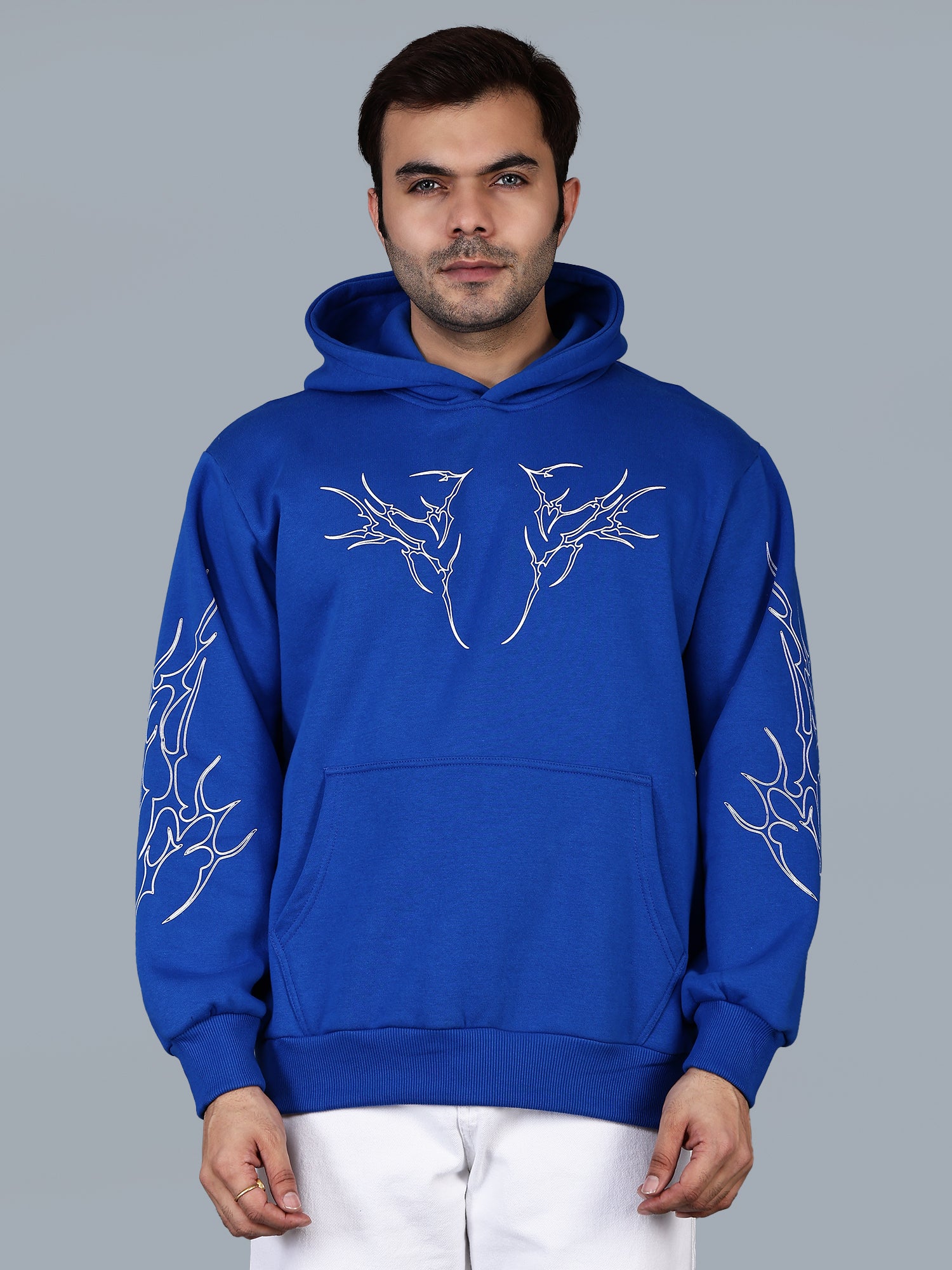 The Ethereal Hoodie brings bold energy with its electric-blue shade and sharp tribal graphics. The metal-style logo on the back adds an effortless alt-street vibe, while the soft, heavy-knit fabric keeps it warm and comfortable for everyday wear. It’s the perfect mix of comfort, attitude, and eye-catching detail - made for anyone who likes their fits loud but effortless.
