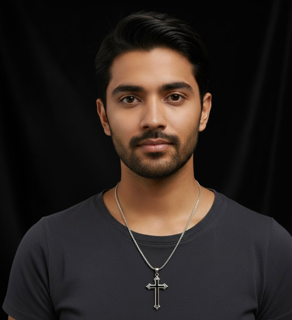 Purity with a pulse. The Saint pendant blends calm energy with bold design. Forged in fearless, it's for the ones who stay grounded yet stand apart.